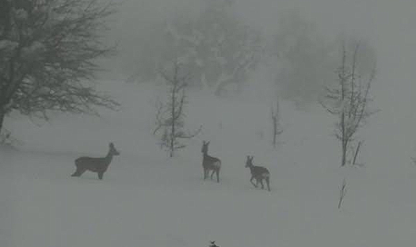 Aracıyla seyir halinde olan sürücü, karla kaplı arazide bekleyen 3 karacayı fark etti. Aracından inen sürücü cep telefonu kamerasıyla kayda girerken, karacalar zıplayarak ağaçlık alana doğru uzaklaşıp gözlerden kayboldu.